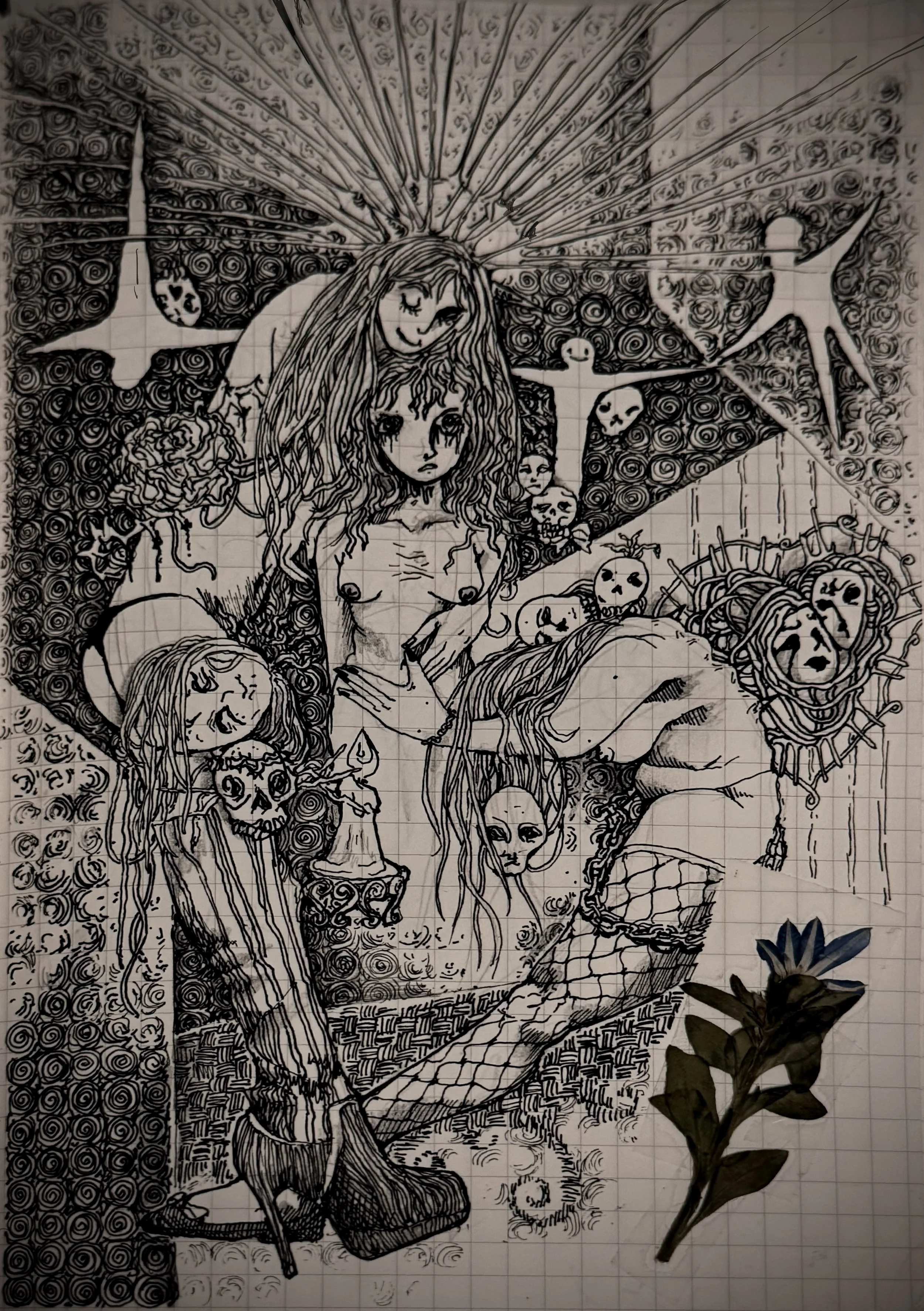 Artist’s Note: This drawing depicts personal events from the last year that left me traumatized and needing help from friends and family. It conveys my up-and-coming relationship with both spirituality and the archetypes created to compartmentalize it. The trauma relates to loss, as I traverse my own dark forest of femininity, gender identity, sexuality, personhood, friendship/sisterhood, motherhood, and a whole world of newly-developed psychological complexes.